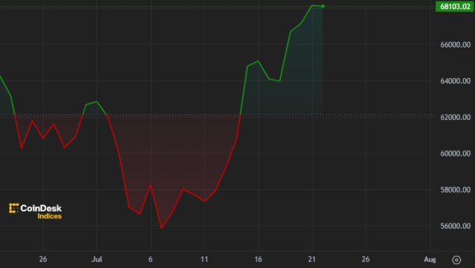 Giá Bitcoin sáng 22/7 cũng có thời điểm tiến sát 68.500 USD một đồng. Đây là mức cao nhất một tháng. "Diễn biến này phản ánh quan điểm của nhà đầu tư rằng bà Harris không thể đánh bại ông Donald Trump trong cuộc đua vào Nhà Trắng. Triển vọng của Bitcoin rất sáng sủa vì Trump có lập trường thân thiện với tiền số", Tony Sycamore - nhà phân tích thị trường tại IG Australia giải thích.