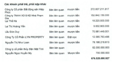 Một số doanh nghiệp là bên liên quan cũng cho mượn số tiền lớn, như Công ty cổ phần Bất động sản Hiệp Phúc (272 tỷ đồng), Công ty TNHH Xây dựng và Kinh doanh Nhà Phạm Gia (gần 153 tỷ đồng), Công ty cổ phần thủy điện Mặt Trời (62 tỷ đồng).