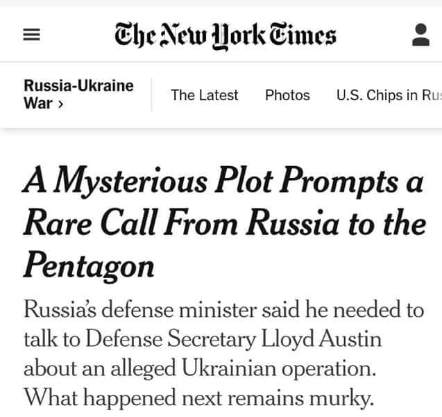 -Nga khám phá kế hoạch khủng bố của Ukraine trên đất Nga. Bộ trưởng quốc phòng Nga , Andrei Belousov gọi điện thoại hỏi bộ trưởng quốc phòng Mỹ, Lloyd J. Austin có dính líu vào đó hay không. Mỹ nói không có tui trong đó và Mỹ gọi cho Ukraine, đừng chơi dại.