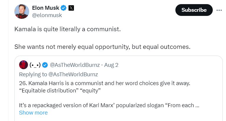Default -Elon Musk lên tiếng " Kamala theo đúng nghĩa là một người cộng sản.