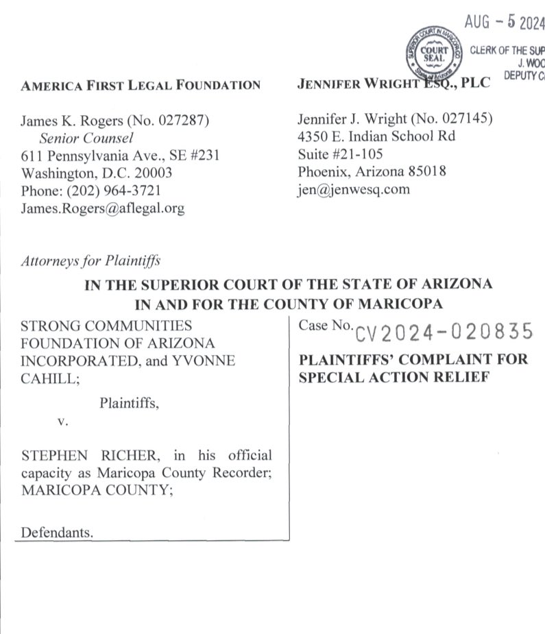 -America first legal Foundation kiện Quận Maricopa, AZ vì đã không chịu loại bỏ tên những người ghi danh bỏ phiếu là di dân bất hợp pháp khỏi danh sách cử tri của họ trước cuộc bầu cử.