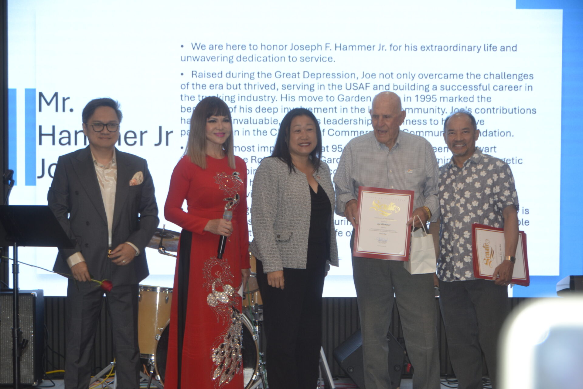 Thượng Nghị Sĩ Janet Nguyễn (giữa) và ban tổ chức vinh danh ông Joseph Hammer (thứ hai từ phải). (Hình: Thiện Lê/Người Việt)