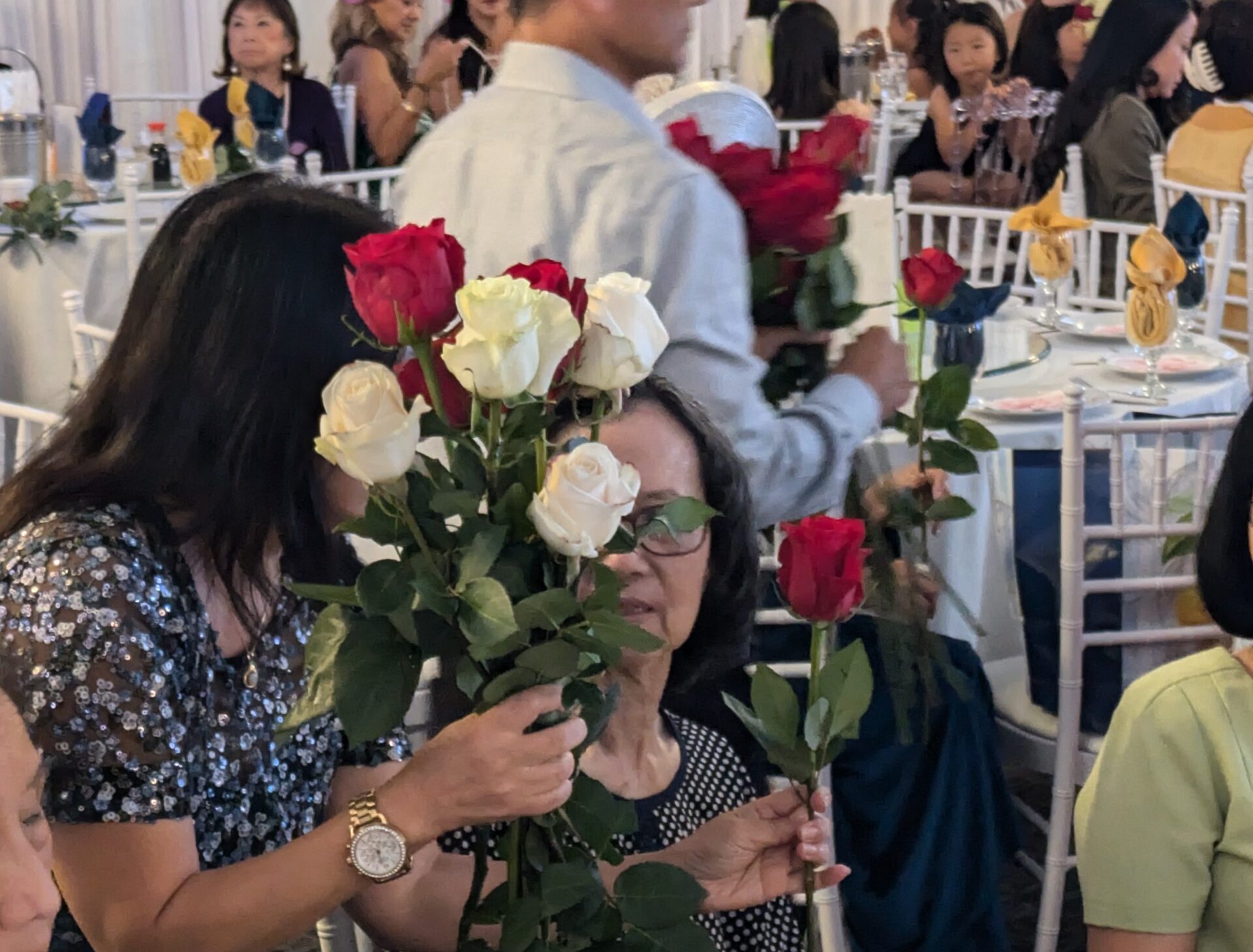 Sau đó, ban tổ chức đi đến từng bàn để phát hoa hồng đỏ và trắng cho những người đến tham dự. MC Kevin Khoa và Thúy Anh giải thích ý nghĩa của bông hồng cho những người thuộc sắc dân khác, cho biết bông hồng đỏ dành cho những người vẫn còn cha mẹ bên cạnh, còn bông hồng trắng dành cho những người không còn cha mẹ nữa, nên phải luôn nhớ về cha mẹ.