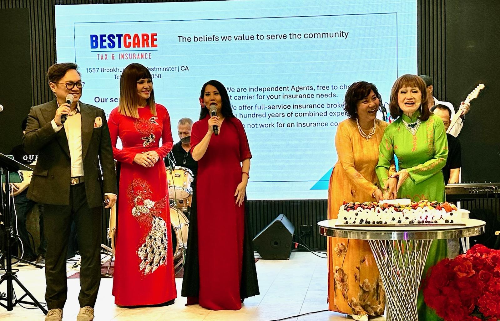 Bà Teri Nguyễn Vũ (thứ hai từ phải), trưởng ban tổ chức, cắt bánh. (Hình: Minh Phú/Người Việt)