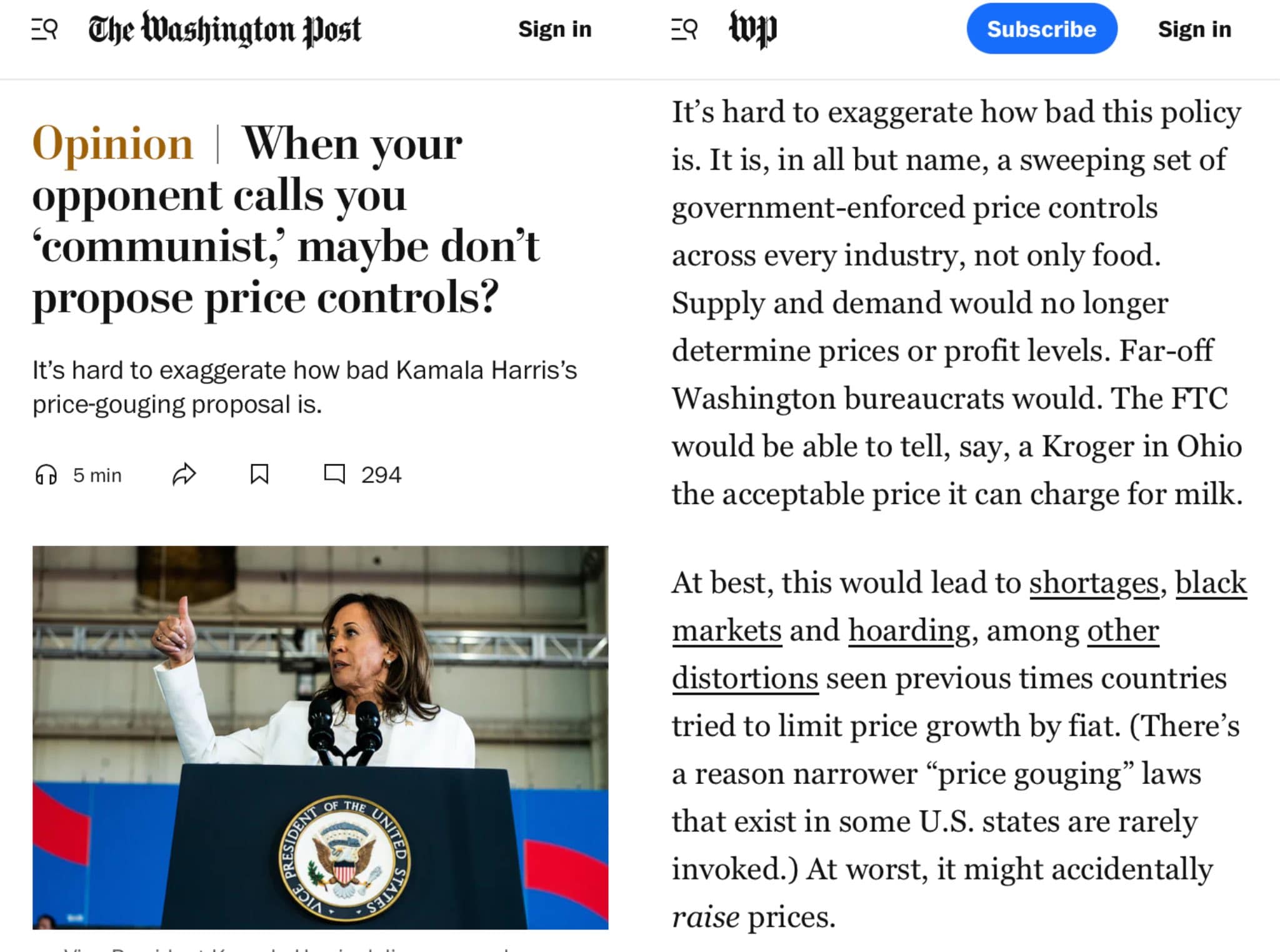 Có thể thấy rằng, chính sách áp đặt giá của Kamala Harris hoàn toàn không mới và chỉ gây ra những hệ lụy vô cùng tồi tệ đến nền kinh tế nếu được áp dụng khi bà ta thắng cử. Đến cả tờ Washington Post, một tờ báo chủ chốt thuộc cánh tả, còn phải giật tít ám chỉ Kamala là ứng viên cộng sản.