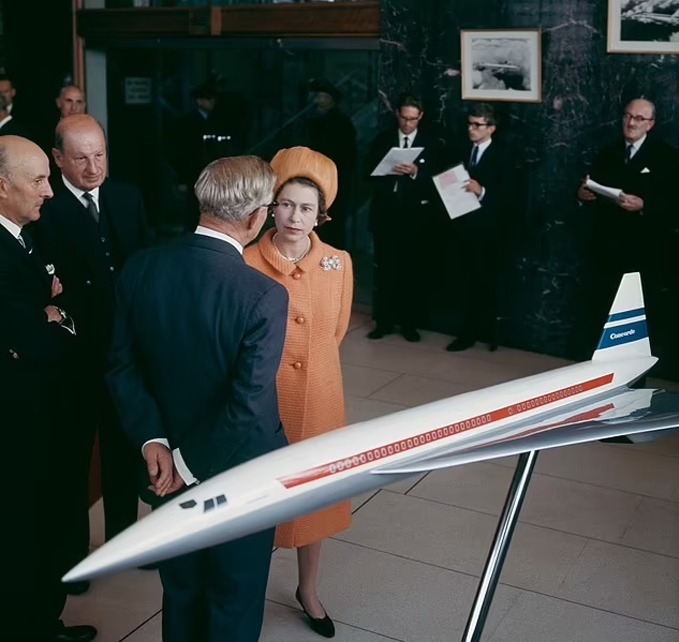 Nữ hoàng Elizabeth II tham quan mô hình máy bay mới năm 1966. Ảnh: UK Press