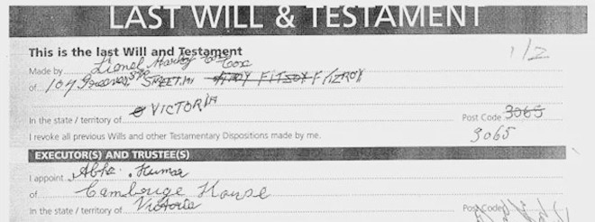 Theo News, một bản sao di chúc của ông Cox cho thấy người đàn ông 92 tuổi này gặp khó khăn thực sự khi điền các thông tin cơ bản nhất. Ông gạch xóa tên họ của mình, địa chỉ, mã bưu chính nhưng khi ghi tên của Abha Kumar và khu dưỡng lão, ông không mắc sai sót nào.