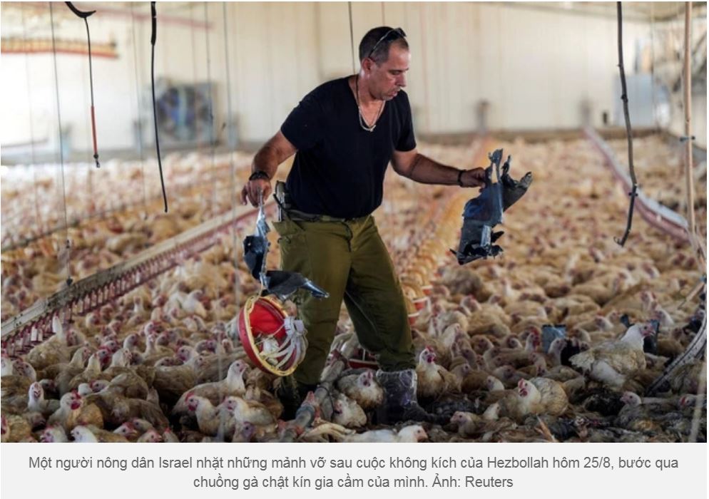 Tuy nhiên, theo tờ Telegraph (Anh), sự tàn phá nặng nề nhất do loạt 300 máy bay không người lái (UAV) và tên lửa được Hezbollah bắn từ Lebanon hôm 25/8 lại là… một chuồng gà bé nhỏ ở miền bắc Israel.