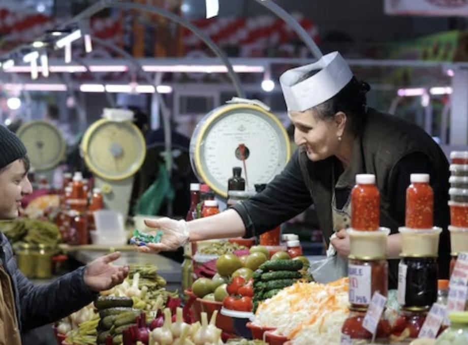 Một người bán hàng đang tặng kẹo cho khách hàng ở một khu chợ thực phẩm ở Saint Petersburg, Nga, ngày 10/11/2023. Ảnh: Reuters