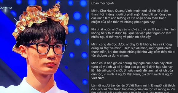 Sau dòng trạng thái gây tranh cãi, trên Facebook của nam sinh cũng xuất hiện dòng trạng thái mới. Theo đó, nam sinh gửi lời xin lỗi đến “những người bị phát ngôn bừa bãi và nông cạn của mình làm ảnh hưởng", và học sinh Quang Vinh "xin nhận hoàn toàn trách nhiệm của bản thân về những phát ngôn này”.