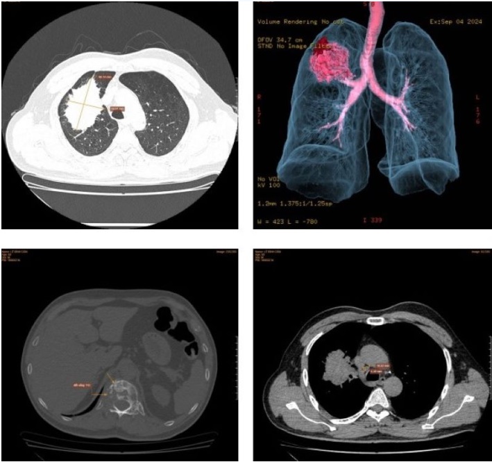Nghi ngờ có khối u ác tính, bác sĩ đã chỉ định bệnh nhân chụp CT phổi liều thấp và phát hiện tổn thương u thùy trên phổi phải, kích thước lớn, đường bờ tua gai co kéo màng phổi vùng tương ứng quanh u. Dựa vào các kết quả trên, bệnh nhân được chẩn đoán u thùy trên phổi phải, theo dõi ung thư phổi di căn. Bệnh nhân đã được chuyển viện tới viện Chợ Rẫy thực hiện quá trình điều trị theo chuyên khoa.