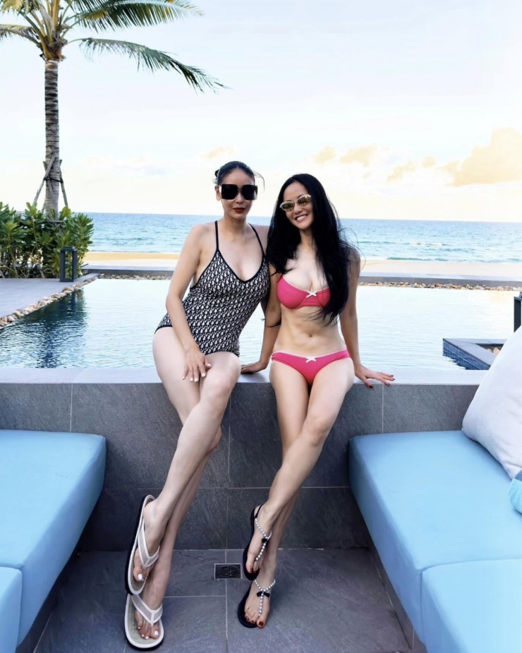 Ở tuổi U60, ca sĩ Hồng Nhung không ngại các kiểu bikini, áo tắm cắt xẻ vì tự tin với hình thể săn chắc sau nhiều năm tập luyện.