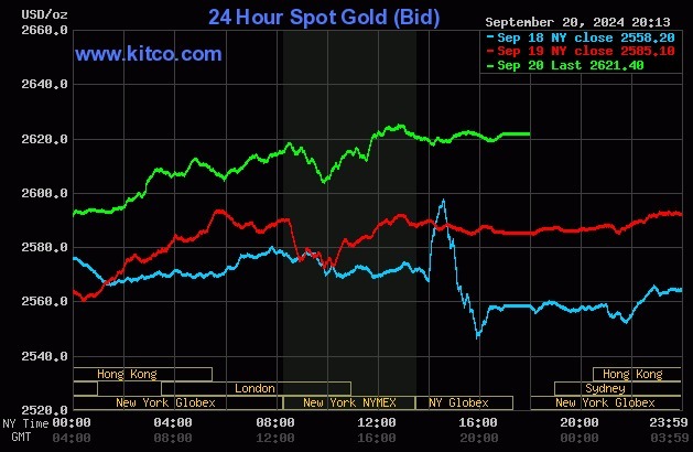 Chốt phiên giao dịch 20/9, mỗi ounce vàng thế giới giao ngay tăng 36 USD lên 2.621 USD. Đây là phiên thứ hai liên tiếp giá lập kỷ lục mới, sau khi Cục Dự trữ liên bang Mỹ (Fed) hôm 18/9 giảm lãi suất tham chiếu thêm 50 điểm cơ bản (0,5%). Lãi suất thấp có lợi cho vàng, do công cụ này không trả lãi cố định.