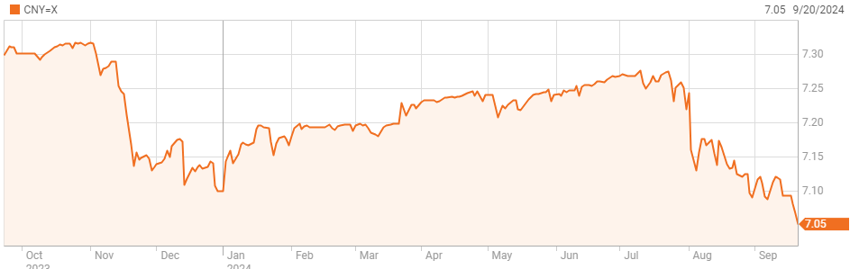 Chiều 20/9, giá nhân dân tệ tại Thượng Hải có thời điểm lên 7,04 CNY đổi một USD - mức cao nhất kể từ tháng 5/2023. Đồng tiền này đang hướng tới phiên tăng giá thứ 6 liên tiếp. Hiện tỷ giá là 7,05 CNY một USD.