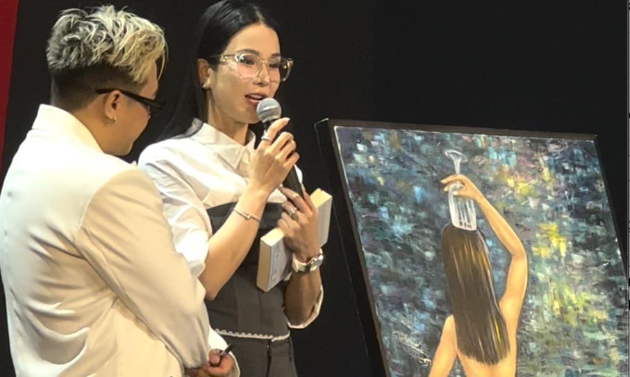 Tác phẩm mang tên Quân tử, vẽ bóng lưng của chính cô khi nhìn từ phía sau. Sau khi tranh về tay chồng cũ, người đẹp nói không hay biết sự xuất hiện của doanh nhân. "Tôi thoải mái vì xem anh như các mạnh thường quân khác tại sự kiện. Phiên đấu giá diễn ra công khai, hợp lệ và số tiền thu được nhằm giúp đỡ được nhiều người là điều tôi quan tâm hơn cả", cô nói.