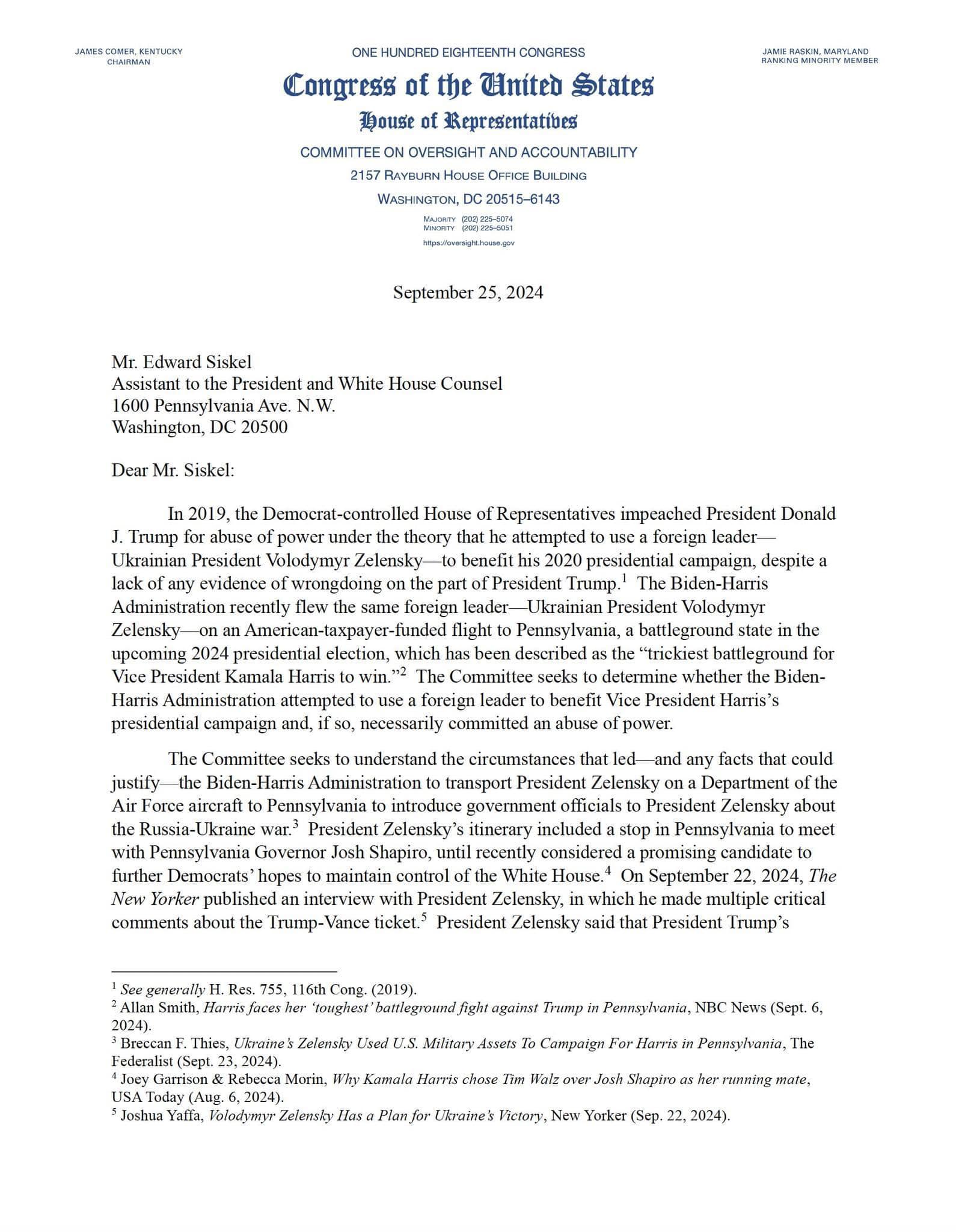 - Chủ tịch ủy ban minh bạch, James Comer gởi công văn đến bộ tư pháp, quốc phòng và Bạch Ốc yêu cầu điều tra việc Chính quyền Biden-Harris sử dụng nguồn tài chánh từ người nộp thuế để đưa Tổng thống Ukraine ,Zelensky đến Pennsylvania để vận động cho Kamala Harris . Nếu Chính quyền Biden-Harris sử dụng một nhà lãnh đạo nước ngoài để mang lại lợi ích cho chiến dịch tranh cử tổng thống của Camala thì đây là hành vi lạm dụng quyền lực và sử dụng sai mục đích tiền thuế của người dân .Hình