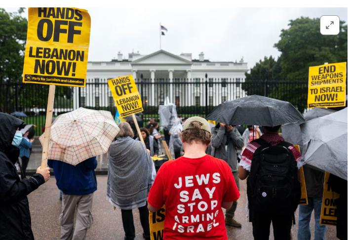 Những nhà hoạt động ở một số thành phố của Hoa Kỳ đã biểu tình vào thứ Ba (24 tháng 9), phản đối sự ủng hộ của Hoa Kỳ đối với Israel khi nguy cơ gia tăng xung đột toàn diện ở Trung Đông. Theo Reuters, hàng chục người biểu tình đã tụ tập tại Herald Square ở Thành phố New York vào tối thứ Ba, mang theo biểu ngữ có nội dung “Hands off Lebanon now” và “no U.S.-Israeli war on Lebanon,” theo nhóm liên minh ANSWER, viết tắt của “Hành động ngay để chấm dứt chiến tranh và chấm dứt phân biệt chủng tộc” (Act Now to Stop War and End Racism). Những người biểu tình hô vang “Hãy tránh xa Trung Đông”, “Giải phóng Palestine” và “Biden, Harris, Trump và Bibi; không ai được chào đón ở thành phố của chúng tôi”, ám chỉ Tổng thống Hoa Kỳ Joe Biden, Phó Tổng thống Kamala Harris, cựu Tổng thống Donald Trump, và Thủ tướng Benjamin Netanyahu của Israel. Một cuộc biểu tình nhỏ hơn với các khẩu hiệu và biểu ngữ tương tự cũng được nhìn thấy gần Tòa Bạch Ốc ở Washington vào tối cùng ngày, bất chấp trời mưa. ANSWER cáo buộc hành động của Israel tại Lebanon và Dải Gaza là diệt chủng, và được tài trợ bởi Hoa Kỳ. Hoa Kỳ vẫn kiên quyết ủng hộ Israel trong cuộc chiến này bất chấp sự chỉ trích trong nước và quốc tế. Vào tháng 5, Tổng thống Biden lặp lại sự ủng hộ dành cho Israel, đồng thời kêu gọi ngừng bắn ngay lập tức và bác bỏ cáo buộc rằng cuộc chiến tại Gaza là diệt chủng.