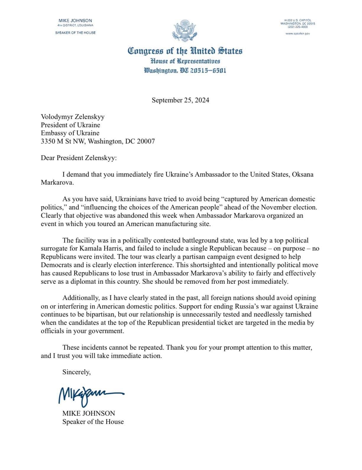 Chủ tịch Hạ viện Mike Johnson mới gửi thư cho TT Zelenskyy đề nghị ngay lập tức thải hồi Đại sứ Ukraine tại Hoa Kỳ là bà Oksana Markarova khỏi chức vụ.