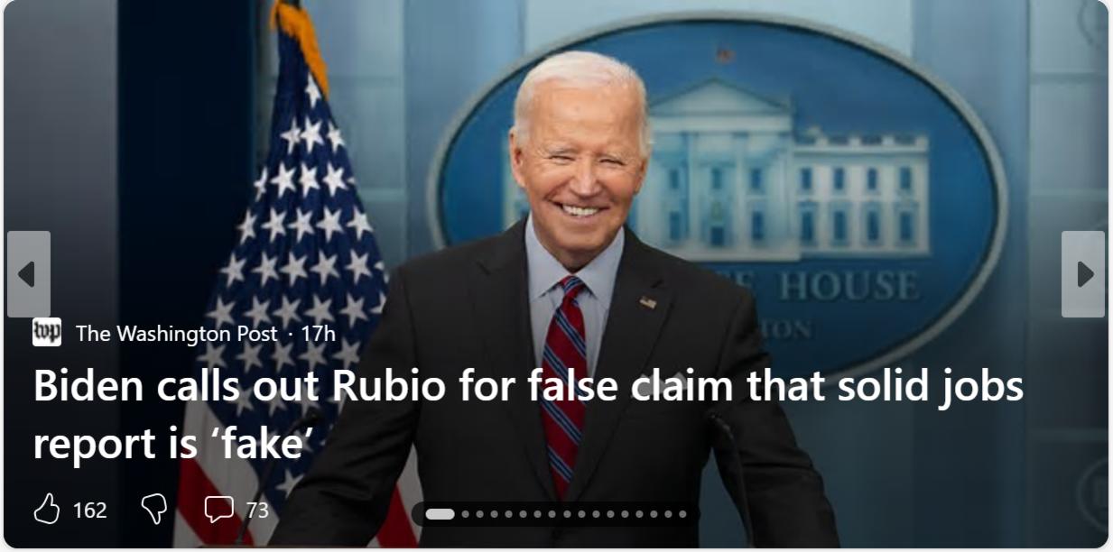 “Bất cứ điều gì mà đảng Cộng hòa MAGA không thích, thì họ gọi là giả. Bất cứ điều gì,” Biden nói. “Số liệu việc làm là những con số việc làm thực tế. Chúng là thật”.
