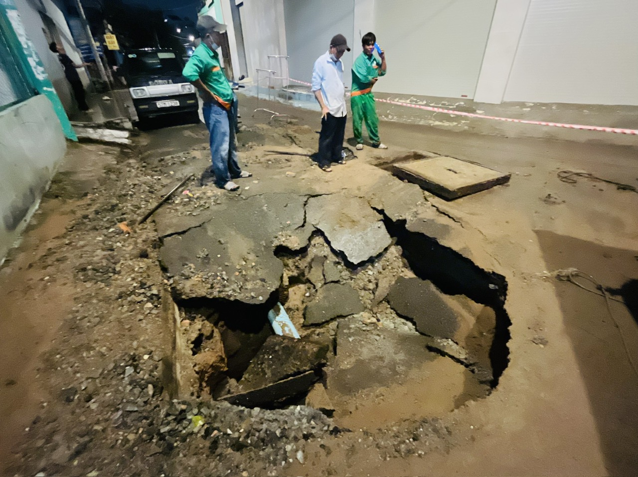 Điểm sụt lún xuất hiện gần hố ga thoát nước trên đầu Đường số 5, phường Tăng Nhơn B, thành phố Thủ Đức. Một số nhân viên đô thị đã túc trực để kiểm tra tình hình thoát nước và báo cáo tình hình điểm sụt lún lên cơ quan chức năng trước khi có phương án khắc phục sự cố.