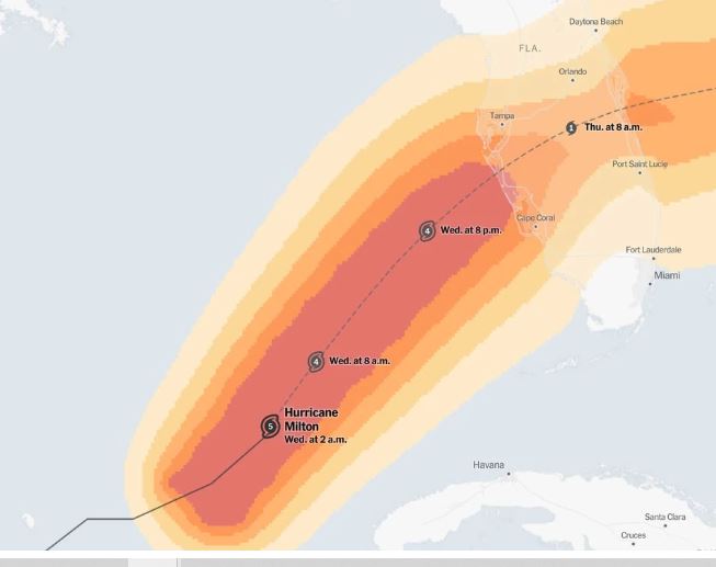 Được mô tả là "cơn bão của thế kỷ", với sức gió liên tục vẫn ghi nhận ở mức 257km/h, Milton đã chuyển hướng đông bắc qua đêm, cách Tampa khoảng 480km về phía tây nam, hướng đến các cộng đồng đông dân và dễ bị tổn thương.