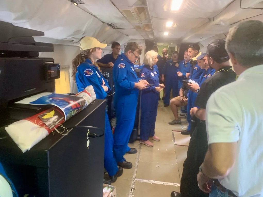 Các nhà khoa học NOAA trên máy bay WP-3D Orion tưởng nhớ đồng nghiệp quá cố Peter Dodge, trước khi thả hộp chứa tro ở mắt bão Milton ngày 8/10. Ảnh: NOAA