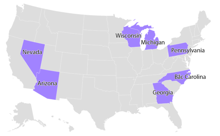 Arizona, Georgia, Michigan, Nevada, Bắc Carolina, Pennsylvania và Wisconsin là 7 bang chiến trường sẽ quyết định ứng viên chiến thắng bầu cử tổng thống Mỹ năm nay.