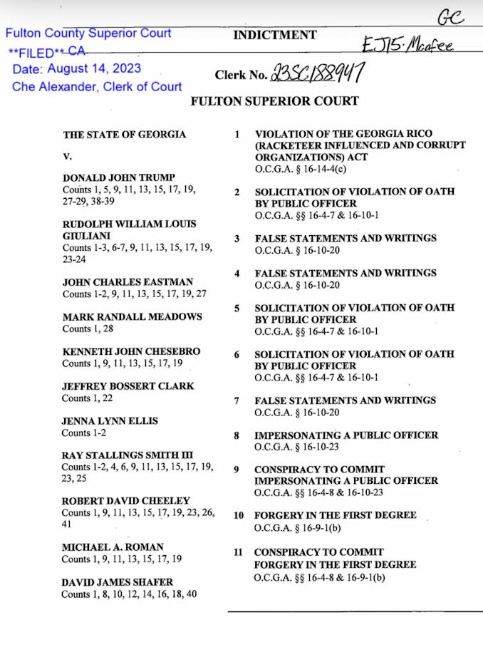 Vào tháng 8 năm 2023, Luật sư Quận Fulton Fani Willis đã truy tố Tổng thống Trump và 18 bị cáo đồng phạm vì dám thách thức cuộc bầu cử năm 2020.