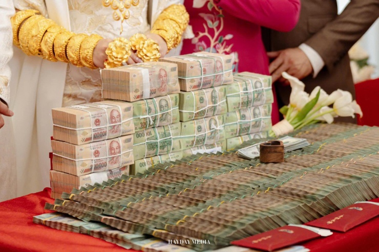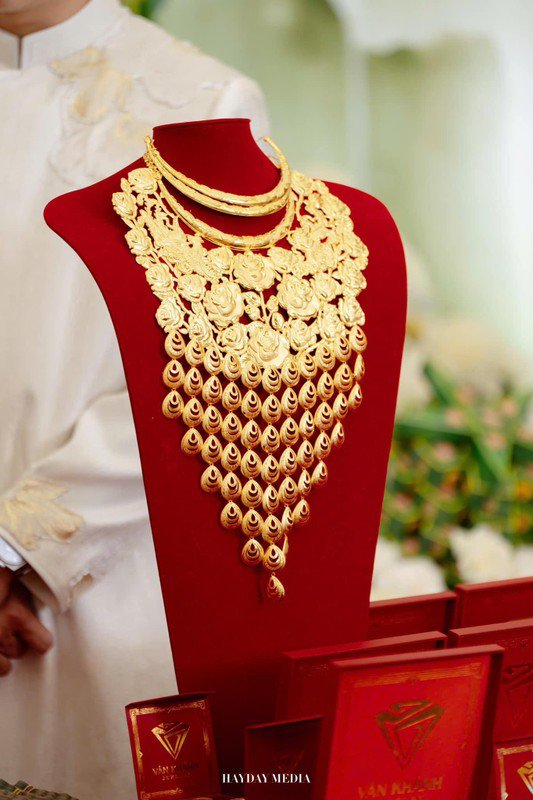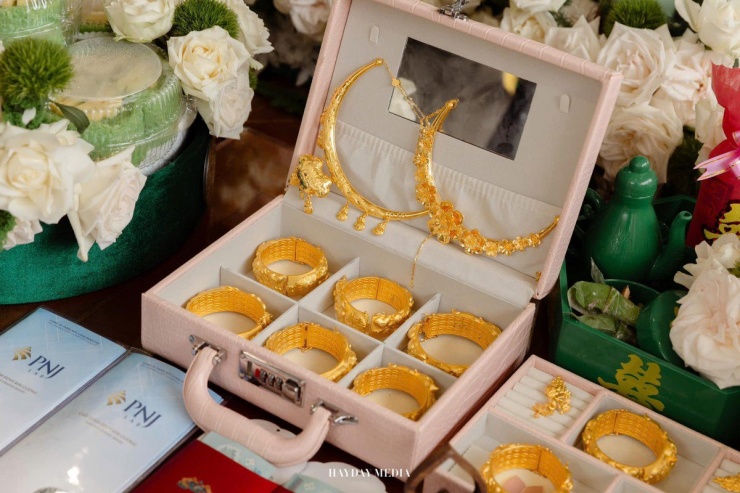 Theo đó của hồi môn của cô dâu được mẹ trao gồm có hơn 1000 cây vàng, 9.9 tỷ tiền mặt cùng nhiều trang sức quý giá khác.