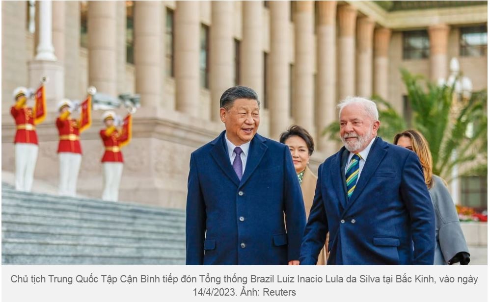 Chủ tịch Trung Quốc Tập Cận B́nh tiếp đón Tổng thống Brazil Luiz Inacio Lula da Silva tại Bắc Kinh, vào ngày 14/4/2023. Ảnh: Reuters