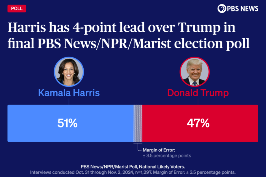 Một ngày trước ngày bầu cử tổng thống năm 2024, Phó Tổng thống Kamala Harris dẫn trước cựu Tổng thống Donald Trump 4 điểm trong số những cử tri tiềm năng trên toàn quốc, theo cuộc thăm dò mới nhất của PBS News/NPR/Marist. Harris có sự ủng hộ của 51 phần trăm cử tri tiềm năng so với 47 phần trăm của Trump - một sự dẫn trước ngay bên ngoài biên độ sai số 3,5 điểm của cuộc thăm dò.