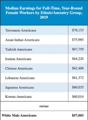 Trên đây là bảng thống kê lợi tức của phụ nữ người Mỹ gốc Á châu so với người Mỹ trắng hồi năm 2019. Người gốc Đài Loan và Ấn Độ đã dẫn đầu.