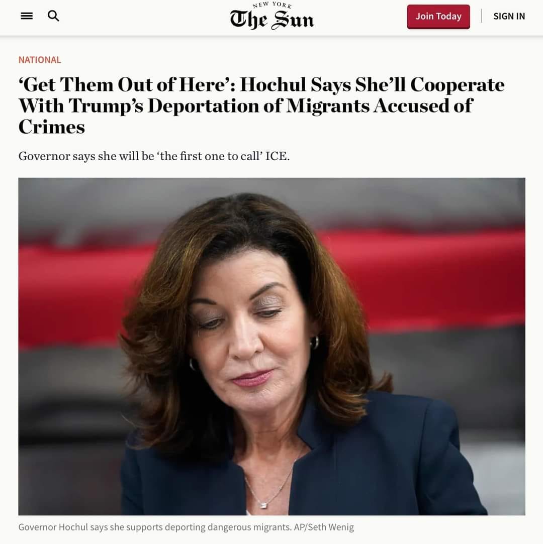 Tuy nhiên, Thống đốc New York Kathy Hochul giờ đây đã quay ngoắt lạ, chuyển thành một giọng điệu khác rồi, và thím nói rằng New York sẽ hợp tác để hỗ trợ Chính quyền Trump trong việc trục xuất hàng loạt những di dân bất hợp pháp đang ở Newyork.