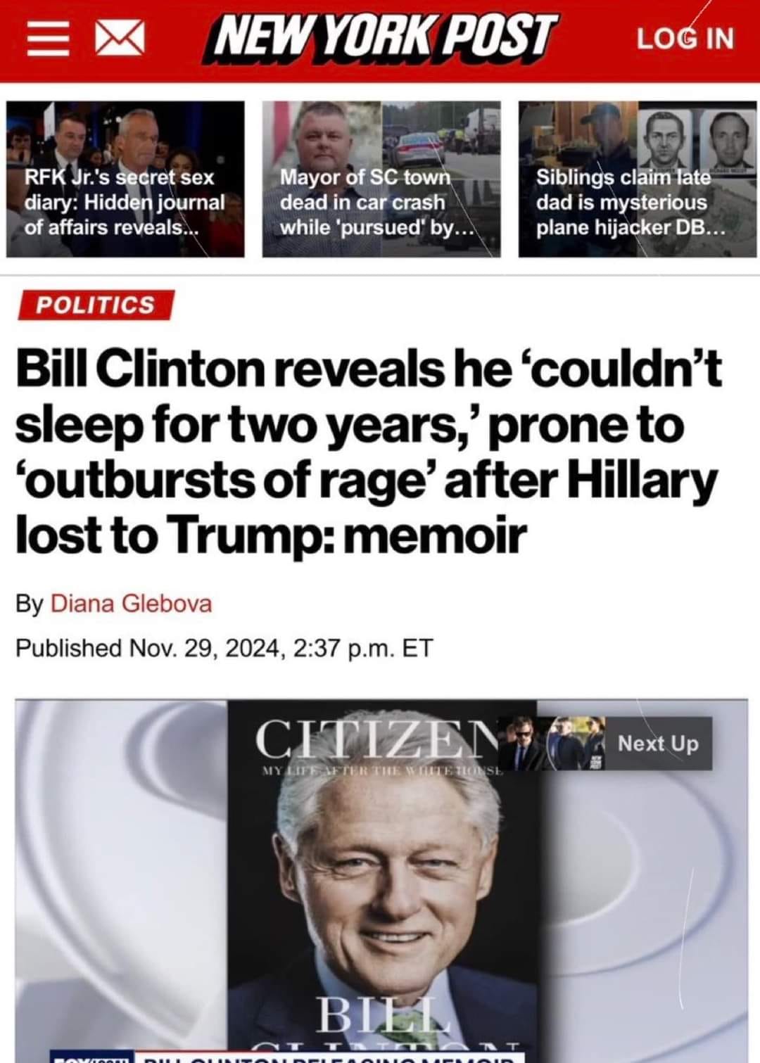 -Trong hồi ký của ông Bill , được NewYork Post tiết lộ : Bill Clinton “không thể ngủ trong hai năm” và “nổi cơn thịnh nộ” sau chiến thắng của Trump giành được ghế Tổng thống năm 2016