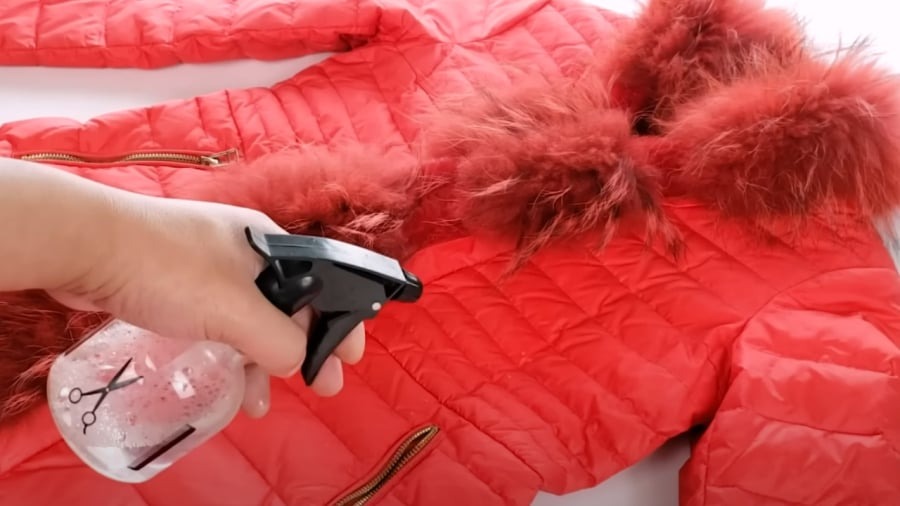 Bạn chuẩn bị một bình xịt. Đổ một ít giấm trắng, nước xả vải và nước sạch vào bình, lắc đều cho các nguyên liệu hòa vào nhau. Nước xả vải vừa có tác dụng bảo vệ áo phao vừa giúp loại bỏ tĩnh điện, ngăn bụi bẩn báo vào áo. Axit acetic trong giấm sẽ giúp làm mền các vết bẩn, tiêu diệt vi khuẩn. Lưu ý, không nên sử dụng nước để làm sạch vì nó có thể làm hỏng áo, đặc biệt là với dòng áo lông vũ.