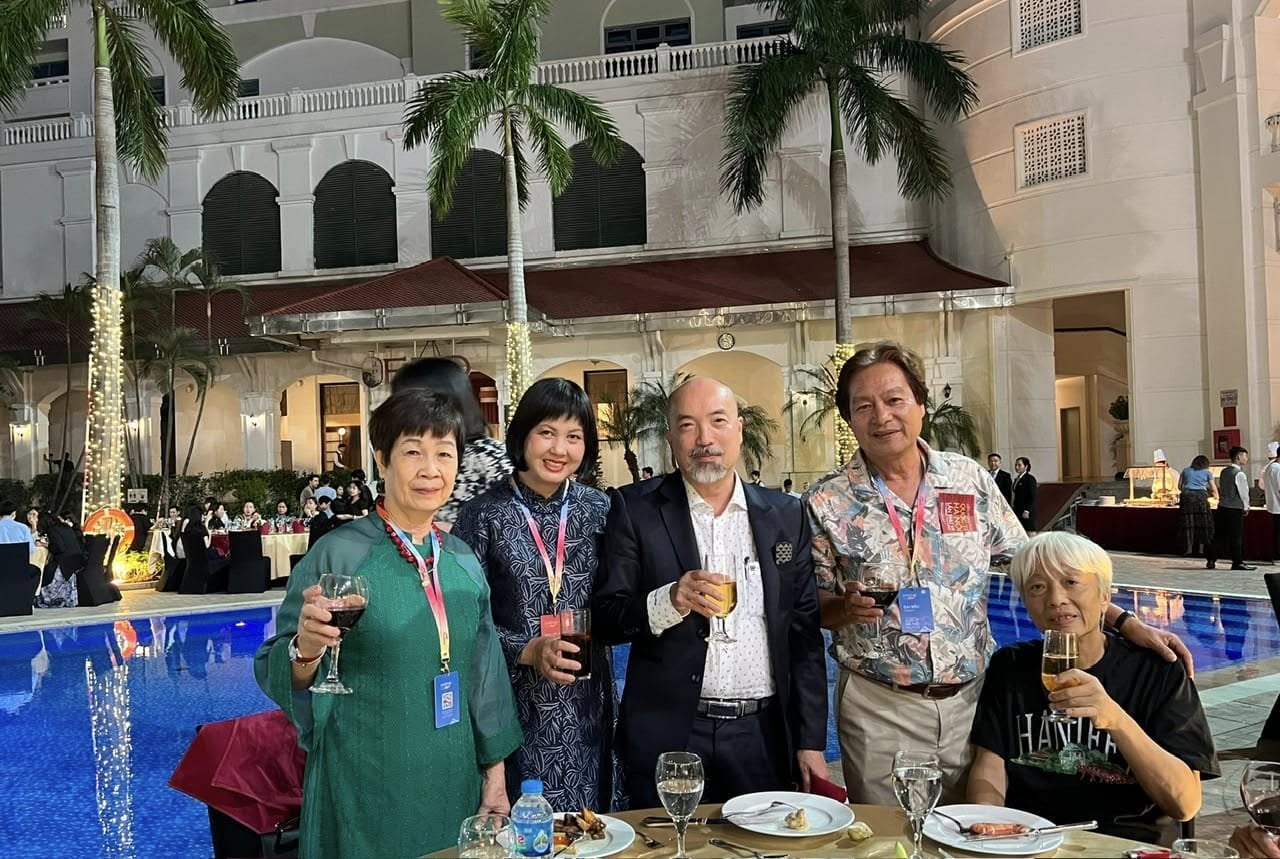 Bức ảnh kỷ niệm của Họa sĩ Trung Phan (tóc bạc) với các đồng nghiệp tại tiệc chiêu đãi Bế mạc LHP Quốc tế Hà Nội lần thứ 7. Ảnh: FBNV