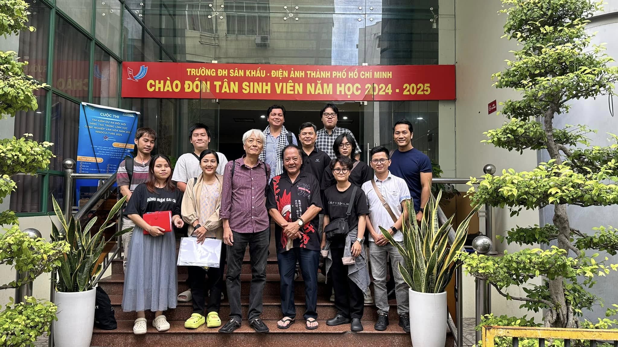 Họa sĩ Trung Phan cùng PGS.TS Đỗ Lệnh Hùng Tú chụp cùng các sinh viên tại trường Đại học Sân khấu- Điện ảnh TP.HCM. Ảnh: FBNV
