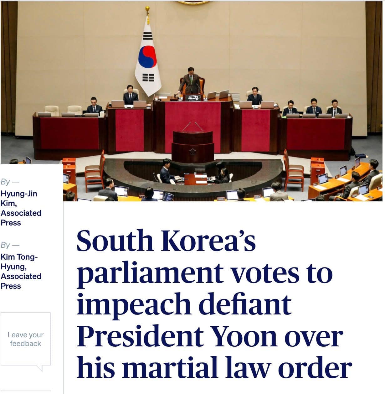 Trong một động thái chấm dứt nhiều ngày tê liệt chính trị nhưng lại tạo ra một cuộc tranh luận dữ dội về số phận của Tổng Thống Hàn Quốc . Hôm qua , Quốc hội đã thông qua động thái đình chỉ chức vụ Tổng Thống của ông Yoon với tỷ lệ 204-85. Quyền hạn và nhiệm vụ của Tổng thống Yoon giao lại cho Thủ tướng Han Duck-soo tiếp quản quyền hạn của Tổng thống vào cuối ngày thứ Bảy. 14/12/2024 . Đây là cuộc bỏ phiếu thứ hai của Quốc hội về việc luận tội Yoon sau khi các nhà lập pháp của đảng cầm quyền tẩy chay cuộc bỏ phiếu ở tầng một vào thứ Bảy tuần trước.