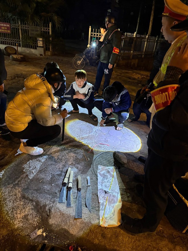 Khi đến khu vực trên, hai đối tượng này gặp và tiếp xúc với hai thanh niên khác đi trên xe ô tô mang BKS: 30H-26225, được xác định là Nghiêm Mai Tuấn D (SN 2007, trú tại phường Phú Thượng, quận Tây Hồ) và Nguyễn Văn H (2009, trú tại huyện Tân Yên, tỉnh Bắc Giang).Tiến hành kiểm tra phương tiện, lực lượng chức năng phát hiện trong cốp xe máy Vision không biển kiểm soát có 1 dao nhọn. Tiếp tục kiểm tra túi đồ của Nghiêm Mai Tuấn D trên xe ô tô, lực lượng làm nhiệm vụ phát hiện, thu giữ 1 túi vải chứa 4 con dao.