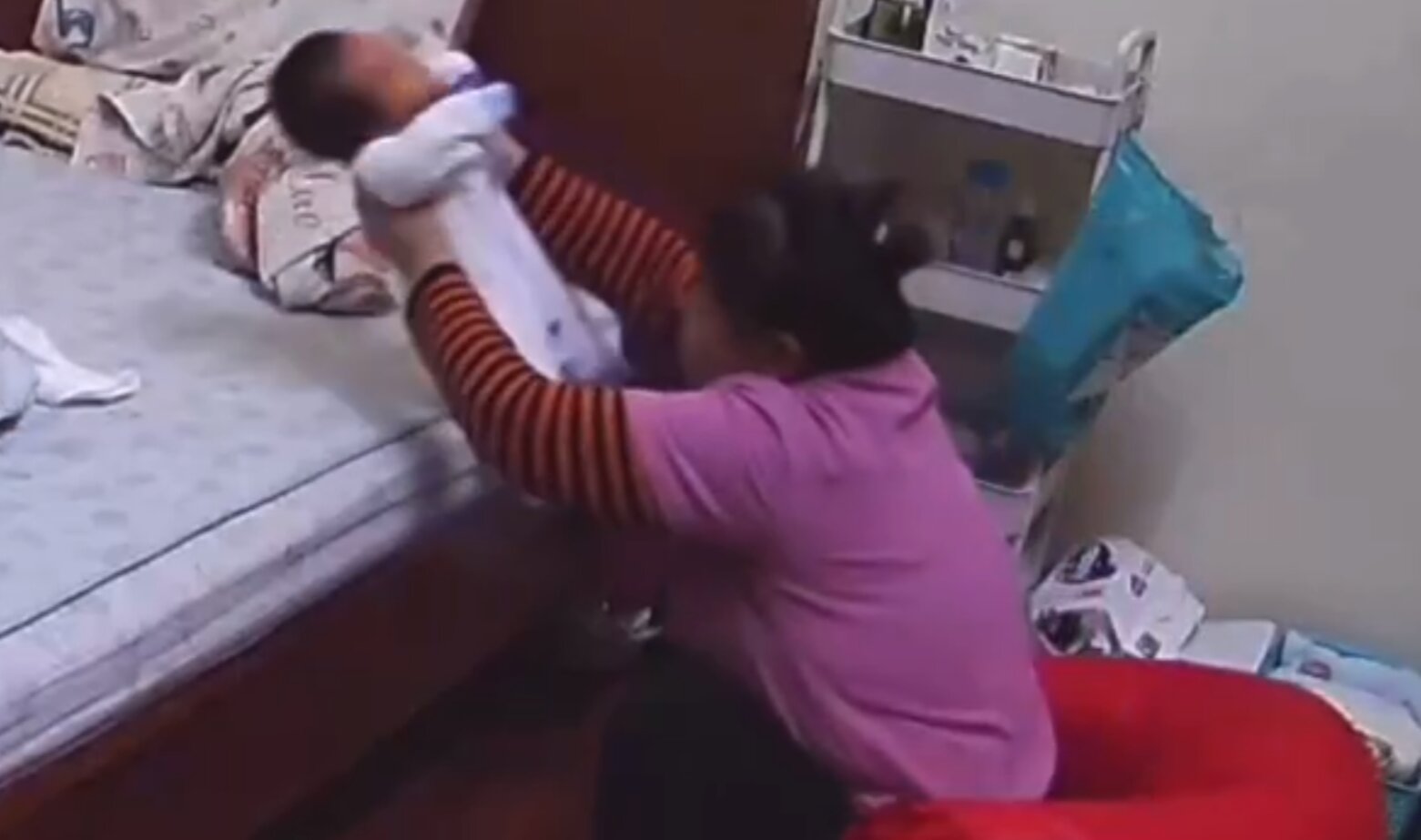Nữ bảo mẫu nhiều lần có hành động đẩy cháu bé ra giường, sốc thẳng lên, lắc lư mạnh. Ảnh cắt từ clip