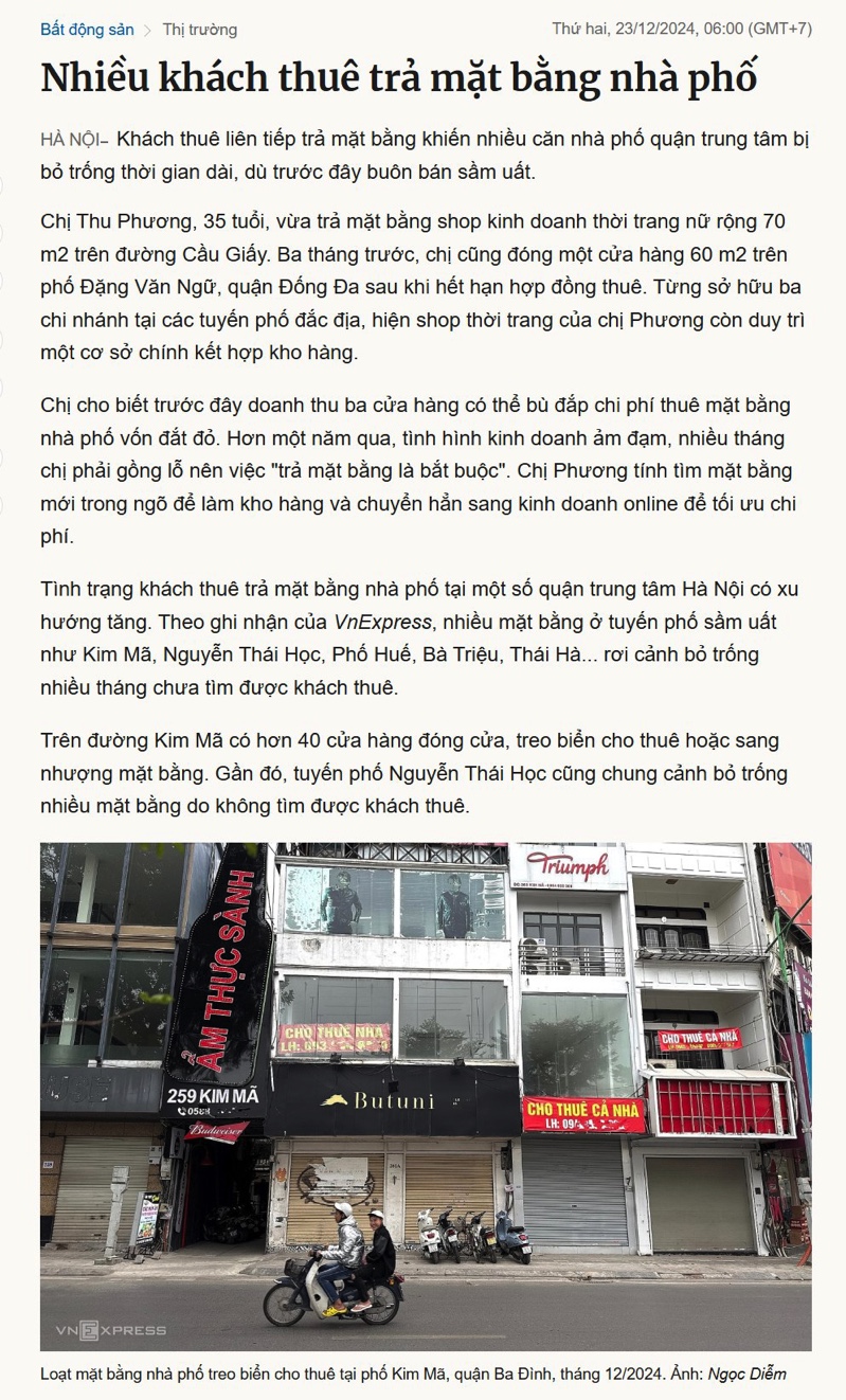 Với 4 yếu tố tôi phân tích kể trên, đặc biệt sự biến mất của văn hóa ''xẹt qua, xẹt lại của xe máy'' (xe máy...rất tiếc sẽ thành phương tiện di chuyển của người thu nhập thấp và có sức mua kém, không còn đóng vai trò lớn về thương mại), cộng hướng với công nghệ, sự thay đổi thói quen của người dùng và đặc biệt là ''bong bóng giá nhà, bong bóng giá thuê bđs'' sẽ khiến loại hình nhà phố thương mại các tuyến phố lớn ngày càng ế và ế.
