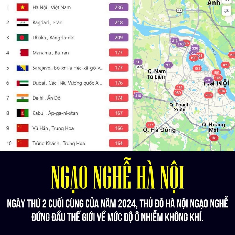 Ngày Thứ 2 cuối cùng của năm 2024, Thủ đô Hà Nội ngạo nghễ đứng đầu thế giới về mức độ ô nhiễm không khí.