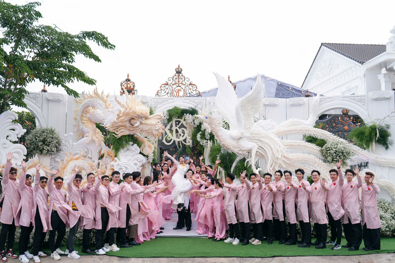 Chiếc cổng cưới có nét độc đáo với tông màu trắng chủ đạo. Phía trước là hai con long phụng khổng lồ có thể cử động, phía sau là hình ảnh mô phỏng dinh thự của gia đình cô dâu.