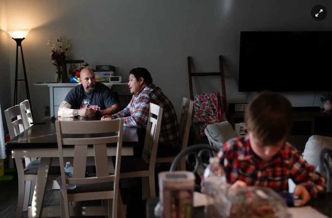 Jaime Cachua và bố vợ Sky Atkins (ngoài cùng bên trái) trao đổi về tương lai của anh. Ảnh: New York Times.