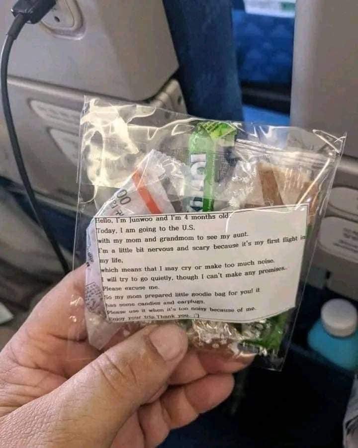 Trên chuyến bay kéo dài 10 tiếng đi từ Nam Hàn đến Mỹ, một người mẹ đã gửi 200 hành khách mỗi người một cái túi. Trong túi đựng kẹo ngọt, kẹo cao su và đồ bịt tai như một lời xin lỗi trước trong trường hợp em bé có khóc trong suốt chuyến bay.
