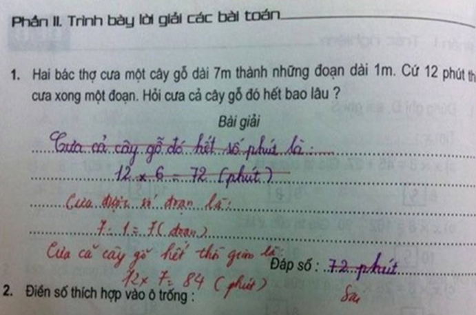 Học sinh đã đưa ra cách giải: "Cưa cả cây gỗ đó hết số phút là: 12 x 6 = 72 (phút)", vì cho rằng đoạn gỗ 7m, cưa thành 7 đoạn 1m bằng nhau thì chỉ cần cưa 6 lần. Tuy nhiên cách làm này bị cô giáo gạch sai và thay bằng đáp án: "Cưa được số đoạn là: 7x1=7 đoạn. Cưa cả cây gỗ hết thời gian là 12x7=84 phút".