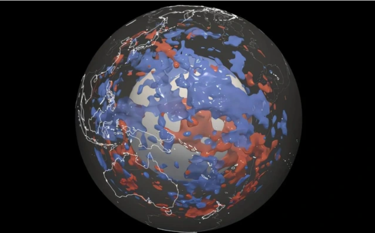 Bản đồ bên trong Trái Đất cho thấy sự tồn tại của các cấu trúc lạ, nơi sóng địa chấn đi qua chậm hơn (màu đỏ) hoặc nhanh hơn (màu xanh)