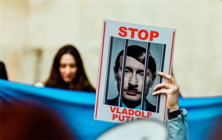 Một người biểu tình đang giơ ảnh Putin như Hitler (Photo by Imad Alassiry on Unsplash)