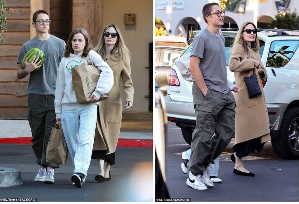 Ngày 14/1, cánh săn ảnh phát hiện Angelina Jolie cùng cặp song sinh Knox và Vivienne bên ngoài cửa hàng thực phẩm sạch Lazy Acres ở Los Angeles, Mỹ. Ba mẹ con nổi tiếng dường như trải qua một buổi mua sắm năng suất khi tay xách, nách mang tiến ra khu vực để xe.