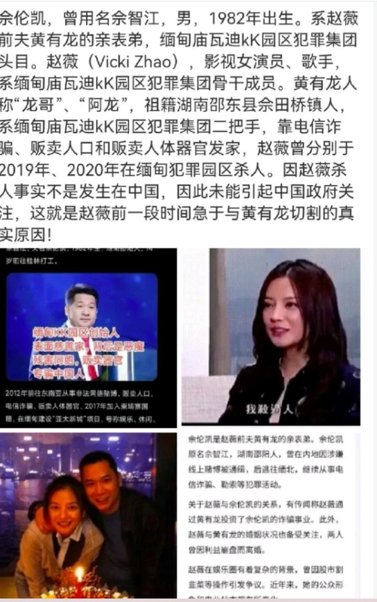Thông tin Triệu Vy và chồng cũ Huỳnh Hữu Long có liên quan đến đường dây lừa đảo, buôn người sang Thái Lan – Myanmar xuất phát từ một tài khoản có tên Chu Giám Hồ 01. Điều đáng nói là người này chỉ có 58 người theo dõi trên Weibo, bài đăng nhắc đến Triệu Vy cũng không có bằng chứng rõ ràng. Vì việc Vương Tinh mất tích ở Thái Lan và được tìm thấy ở Myanmar gần đây nên bài viết này nhanh chóng thu hút sự chú ý lớn.